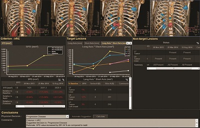 - Selectable oncology response criteria including standards such as RECIST 1.0, RECIST 1.1, WHO, CHOI, PERCIST, irRC and mRECIST, as well as PET SUV analysis including glucose-corrected SUV.