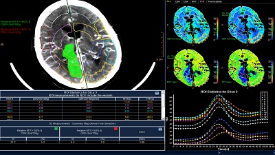 about changes in image intensity over time. The application calculates and displays quantitative color maps of cerebral blood flow (CBF), cerebral blood volume (CBV), mean transit time (MTT) and time-to-peak (TTP), and provides summary maps which may help physicians in determining areas of reduced cerebral blood flow compared to the contra lateral hemisphere.